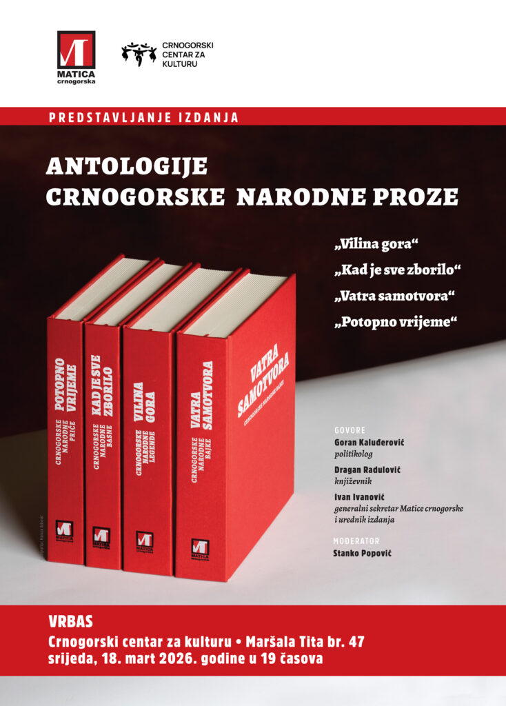 Četiri antologije crnogorske narodne proze, „Vilina gora“, „Kad je sve zborilo“, „Vatra samotvora“ i „Potopno vrijeme“, koje je Matica crnogorska poslije gotovo pet decenija ponovo objavila, biće promovisane u srijedu, 18. marta u 19 sati u Crnogorskom centru za kulturu (CCK) u Vrbasu (Maršala Tita broj 47). Organizatori promocije su Matica crnogorska i Crnogorski centar za kulturu iz Vrbasa.
