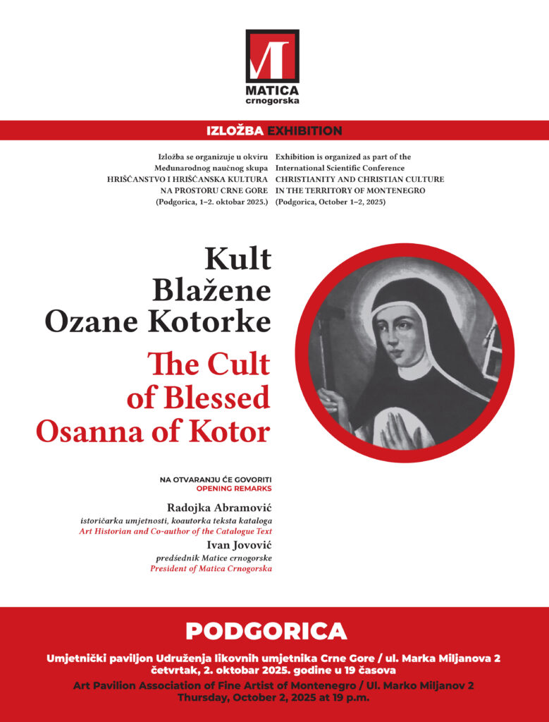 Izložba „Kult Blažene Ozane Kotorke“ koju je priredila Matica crnogorska biće otvorena u Umjetničkom paviljonu Udruženja likovnih umjetnika Crne Gore 2. oktobra u 19 sati. Izložbu će otvoriti Predsjednik Matice crnogorske Ivan Jovović, a o kultu crnogorske svetice govoriće istoričarka umjetnosti Radojka Abramović, koautorka kataloga. U muzičkom dijelu programa će nastupiti vokalna solistkinja Zorana Latković i profesor gitare Nikola Pejović koji će izvoditi djela Paizijela i Hendla.