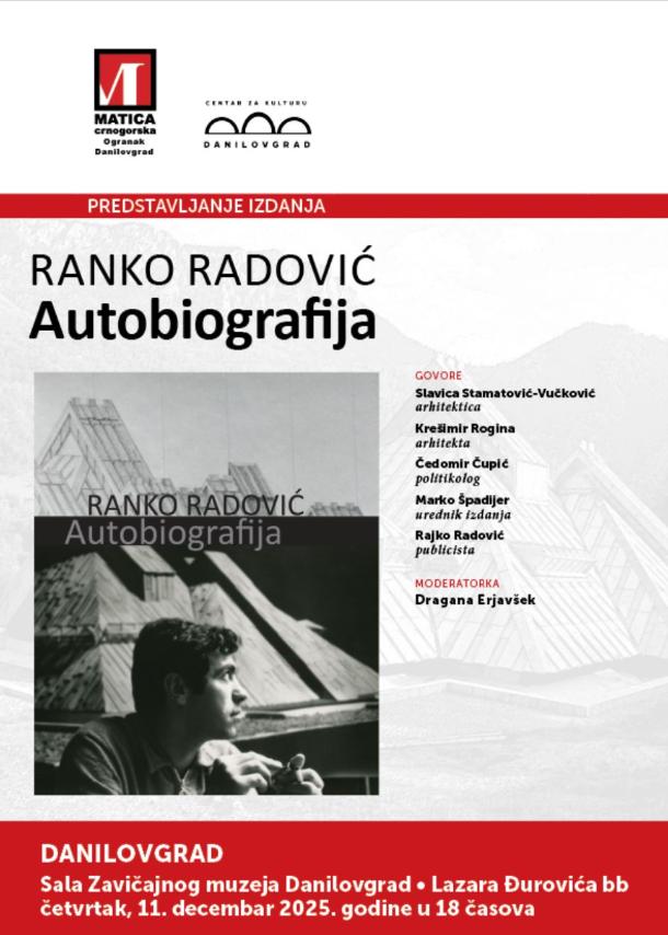 Knjiga „Autobiografija“ jednog od najistaknutijih arhitekata i teoretičara arhitekture s prostora bivše Jugoslavije, Ranka Radovića, biće predstavljena u četvrtak, 11. decembra u 18 sati u sali Zavičajnog muzeja u Danilovgradu. O izdanju koje je nedavno objavila Matica crnogorska će govoriti arhitekte Slavica Stamatović-Vukčević i Krešimir Rogina, politikolog Čedomir Čupić, publicista Rajko Radović i urednik izdanja Marko Špadijer.