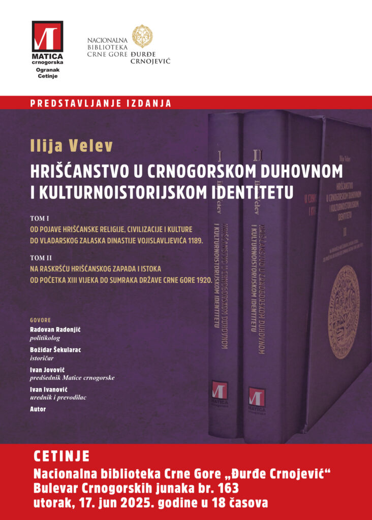 Dvotomna studija prof. dr Ilije Veleva „Hrišćanstvo u crnogorskom duhovnom i kulturnoistorijskom identitetu“ koju je Matica crnogorska objavila krajem prošle godine biće promovisana na Cetinju u utorak, 17. juna u 18 sati u Nacionalnoj biblioteci „Đurđe Crnojević“. O knjizi će govoriti, istoričar Božidar Šekularac, politikolog Radovan Radonjić predsjednik Matice crnogorske Ivan Jovović i generalni sekretar Matice crnogorske Ivan Ivanović koji je studiju preveo na crnogorski jezik.